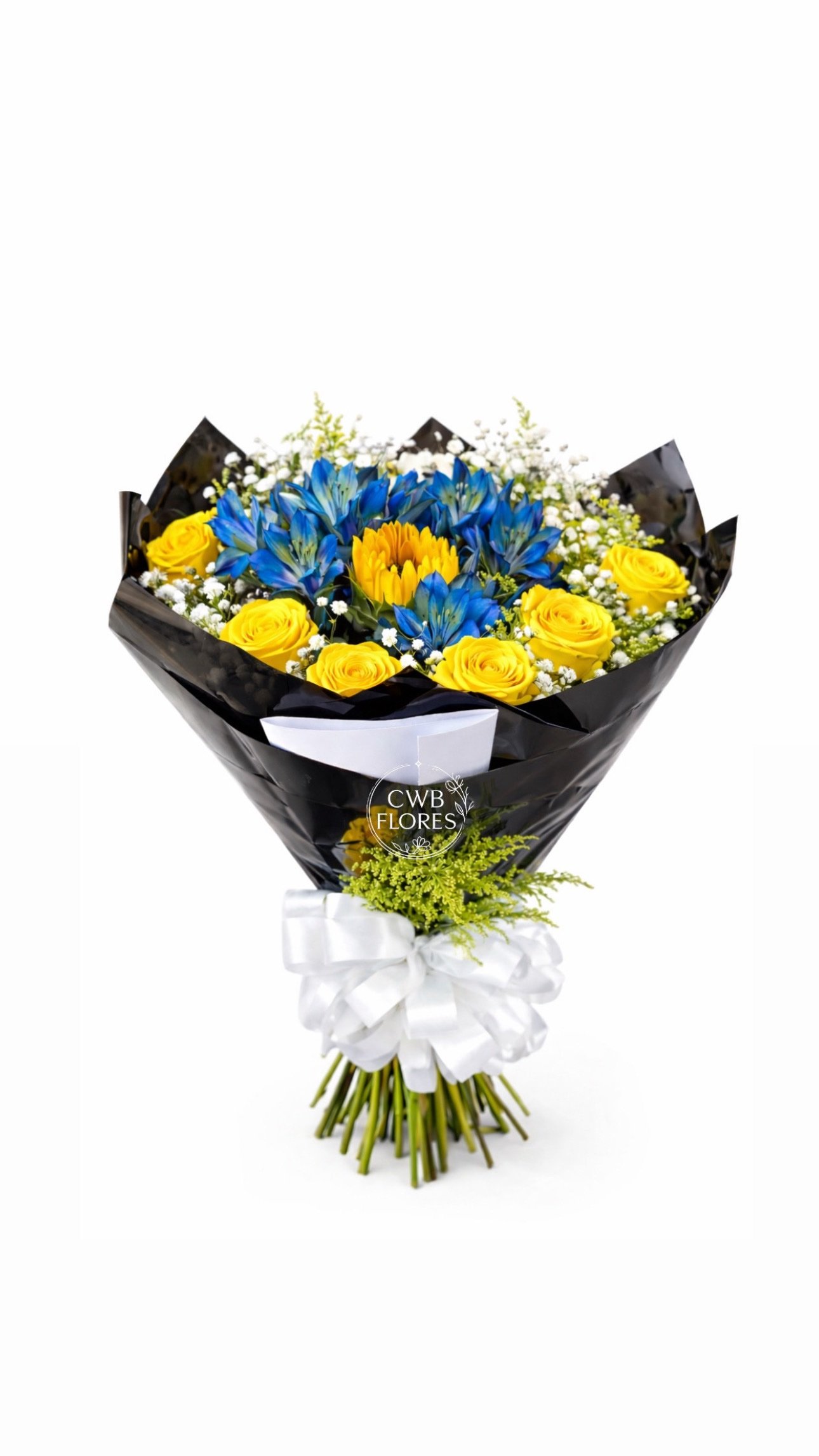O buquê de flores azuis e amarelas é uma combinação vibrante e cheia de personalidade, ideal para surpreender com cor, alegria e beleza. Ele une a delicadeza das astromélias, o charme clássico das rosas e a energia radiante dos girassóis, criando um arranjo moderno, harmonioso e impossível de passar despercebido.