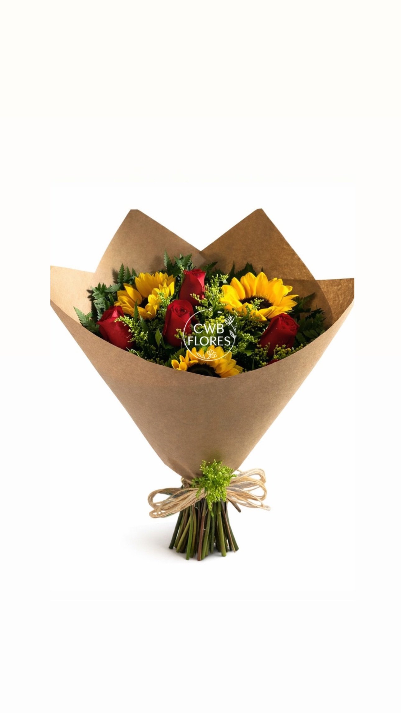 O buquê com 5 rosas vermelhas, 3 girassóis e flores do campo é uma combinação marcante que une romantismo, alegria e delicadeza em um só presente.